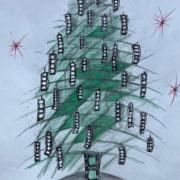 L’intreccio tra cinema e pittura è evidente. In un altro quadro, in bianco e nero, la pellicola del vecchio 35 millimetri si assottiglia sempre di più fino a sembrare un pennello che ,a sua volta, si trasforma nella figura umana stilizzata che , moltiplicata per tante volte, forma il pubblico di una sala cinematografica. Passione e amore per il cinema hanno qui un’origine lontana nel tempo: nascono dall’amicizia con Aldo Tassone, scrittore raffinato e critico cinematografico, e sono rigenerate dall’incontro fecondo con Pasquale Persico, economista e docente universitario. La mostra “Les amoureux du cinèma”, che tanto consenso registra a Roma, prima tappa del lungo itinerario che si conclude a Parigi, nasce da una idea per la scenografia della ventiduesima edizione del Villammare Festival. Un disegno, che sembra appena abbozzato, rappresenta una idea di grande valore universale. Due persone, di spalle, in una fila di poltrone rosse, guardano uno schermo. Sono innamorati del cinema, ma sono anche innamorati tra loro?